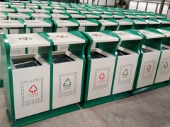 【喷涂工艺】:户外垃圾桶采用新型的剪钣下料,折弯、冲压、焊接、打磨、等工艺:表面经过除油、喷砂防锈处理后,再进行酸洗磷化处理,;表面清理干燥后整体进行静电喷涂,涂层厚度达到2mm,经过流水线高温固化炉固化后再出炉冷却,加工后的塑粉附着力强,不易剥落;
