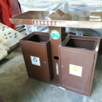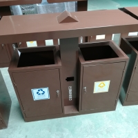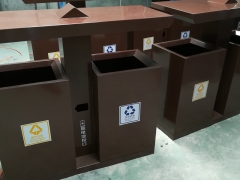 【材    质】:垃圾桶可选用优质的工业冷轧板、镀锌板、复合材料、不锈钢等材料,(可根据客户要求或图纸制作)。垃圾桶经过专业裁板、折边、数码设计冲孔后无缝焊接成型,再经过打磨、抛光工艺经喷砂处理去油去锈后再采用立邦户外漆喷涂后放置在190度烤漆房烘干后取出完成防腐防锈过程。