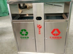 【产品配件】:户外分类垃圾桶配镀锌板内胆2个,镀锌废旧电池回收盒,灭烟盒各一个,膨胀螺丝4个,钥匙一把。